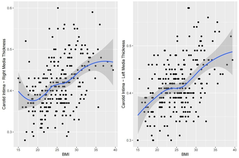 Our study revealed a significant association between anthropometric measurements and cIMT in obese adolescents and further explored the nonlinear relationships among the WHR, BMI, blood pressure and cIMT, as well as their independent effects on cIMT. Given the increasing prevalence of obesity and hypertension among children and adolescents globally (21, 22), early screening and intervention strategies are urgently needed to reduce cardiovascular risk in the future.