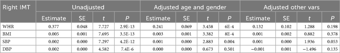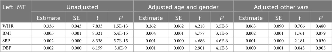 To comprehensively evaluate the independent effects of each index on cIMT, multivariate logistic regression analysis was performed. The analysis revealed that, after adjusting for other covariates, SBP was the only anthropometric measure among those analyzed that maintained a statistically significant independent association with cIMT (P < 0.05), as presented in Tables 3, 4. This finding suggests that SBP may be a key target for interventions to reduce cardiovascular risk in this population.