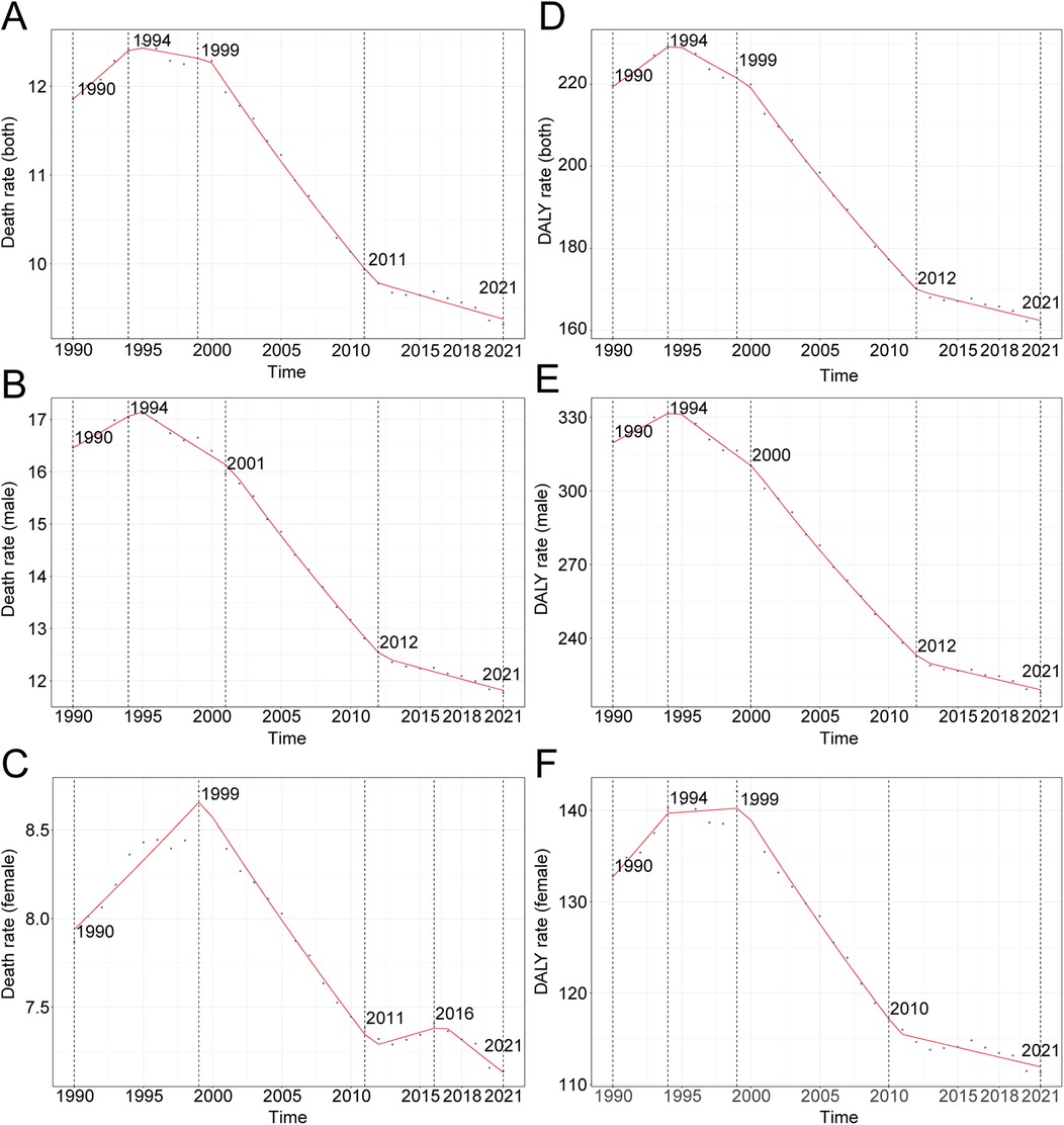 Figure 1. Annual percent change (APC) and trends in global aortic aneurysm mortality and disability-adjusted life years (DALYs) from 1990 to 2021. (A) Death rate (both sexes); (B) death rate (males); (C) death rate (females); (D) DALY rate (both sexes); (E) DALY rate (males); (F) DALY rate (females).