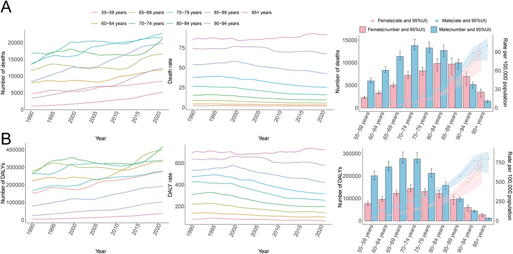 Mortality and DALY rates per 100,000 population, along with their 95% uncertainty intervals (UI), were calculated according to GBD protocols. Trends over time were assessed using the Joinpoint regression model, which estimates annual percentage change (APC) and corresponding 95% confidence intervals (CI) to capture period-specific trends (21). This approach provides detailed insights into year-to-year variability. The average estimated annual percentage change (EAPC) and its CI were calculated using a log-linear regression model to quantify long-term trends in mortality and DALYs from 1990 to 2021 among adults aged ≥55 years (22). EAPC is particularly valuable for evaluating overall temporal trends, as it reflects whether rates have generally increased or decreased over the study period, irrespective of short-term fluctuations. An EAPC with a lower 95% CI bound greater than zero indicates a significant upward trend, whereas an upper 95% CI bound below zero denotes a significant downward trend. Associations between disease burden metrics and SDI were examined using curve fitting. All analyses were conducted using R software, version 4.4.2, with statistical significance set at p < 0.05.
