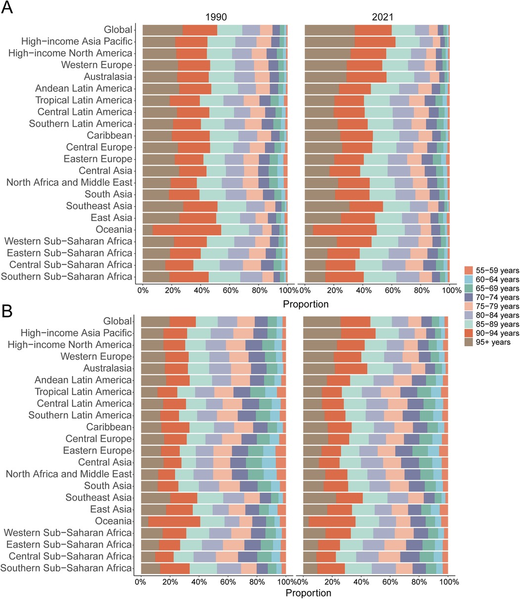 Figure 3. Age-specific percentages of aortic aneurysm mortality and disability-adjusted life years (DALYs) in 2021. (A) Deaths. (B) DALYs.