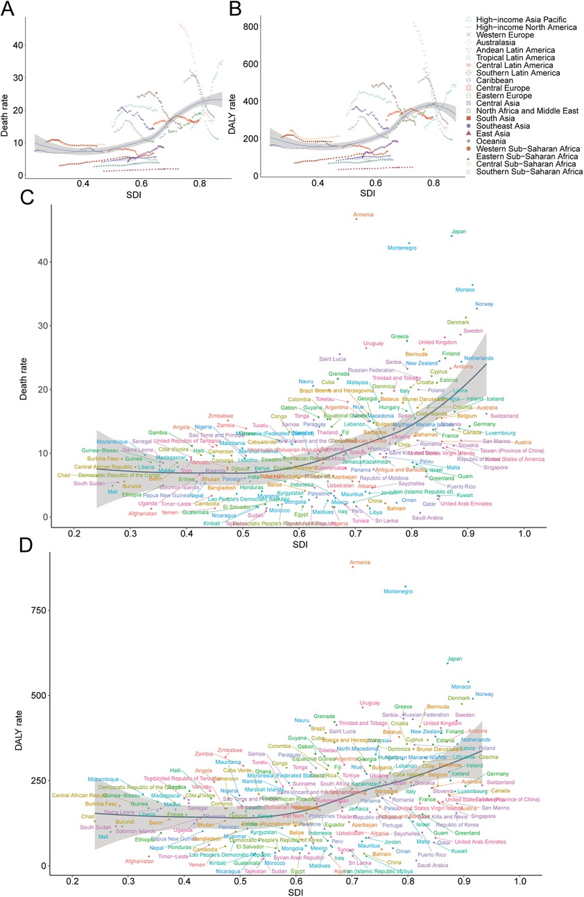 In 2021, Western Europe reported the highest absolute number of AA-related deaths (26,510.0; 95% UI, 23,076.7–28,162.7), whereas the High-income Asia Pacific region recorded the highest mortality rate (35.26 per 100,000; 95% UI, 28.40–39.17). The most significant decrease in AA-related mortality rates was observed in High-income North America, with an estimated annual percentage change (EAPC) of −4.22 (95% CI, −4.55 to −3.89). Conversely, High-income Asia Pacific exhibited the largest increase (EAPC, 3.18; 95% CI, 3.05–3.31). Globally, with an average SDI of 0.67, AA mortality rates exceeded the global mean (9.32 per 100,000) in 11 regions, whereas 10 regions were below this global average (Table 1, Figure 4A).