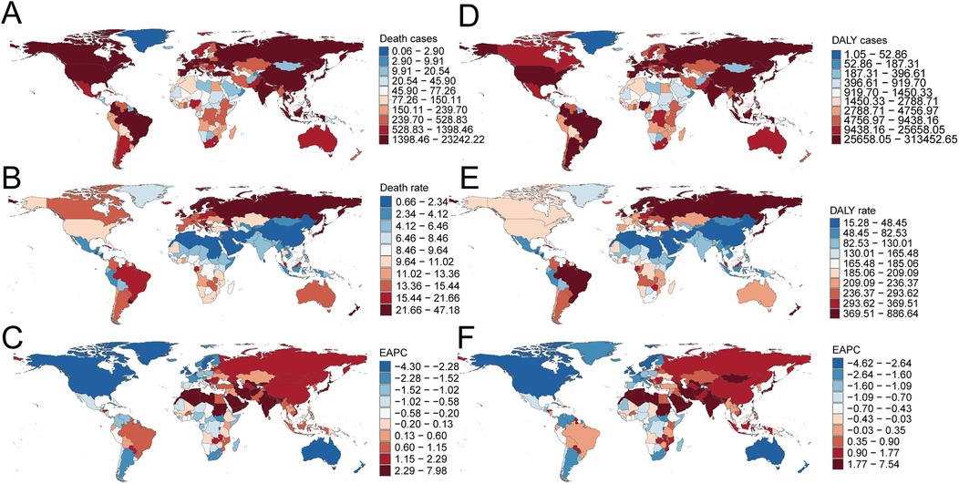 Figure 5. Death and disability-adjusted life-years (DALYs) cases of aortic aneurysm in 204 countries and territories. (A) Death cases; (B) death rate; (C) EAPC for death rate; (D) DALY cases; (E) DALY rate; (F) EAPC for DALY rate.