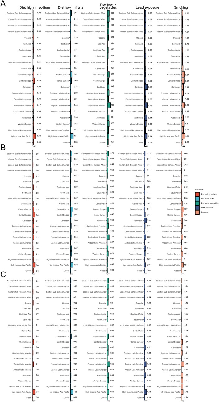 Figure 6. Aortic aneurysm deaths attributable to key risk factors. (A) Both sexes; (B) males; (C) females.