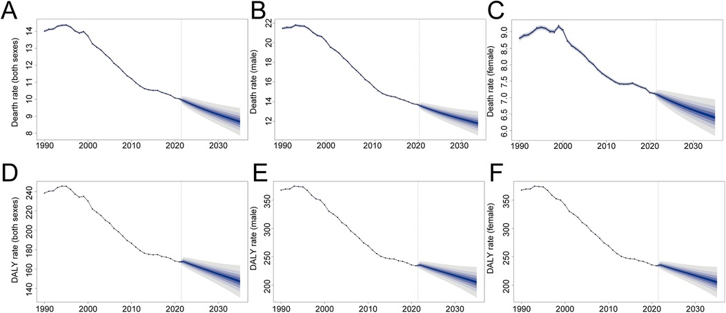Figure 7. The change trends of the aortic aneurysm burden by sex from 1990 to 2035. (A) Death rate (both sexes); (B) death rate (males); (C) death rate (females); (D) disability-adjusted life-year (DALY) rate (both sexes); (E) DALY rate (males); (F) DALY rate (females).