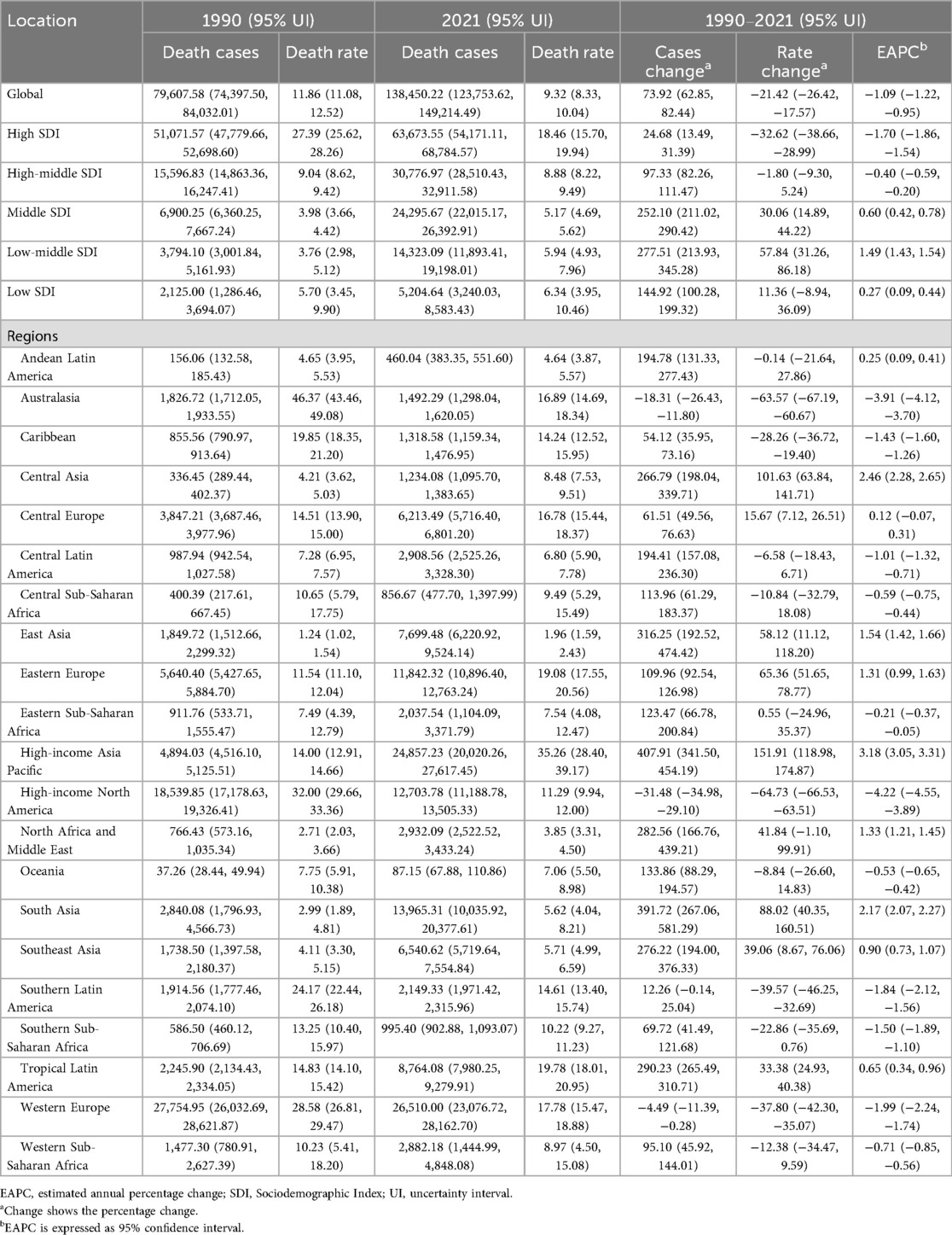 In this study, we present the first systematic epidemiological evaluation using data from the GBD study spanning 1990 to 2021. This study delineates global mortality and DALYs, stratified by region, country, gender, and age group. The findings furnish essential, high-quality evidence to inform public health policy and enable the development of precisely targeted prevention and intervention strategies.