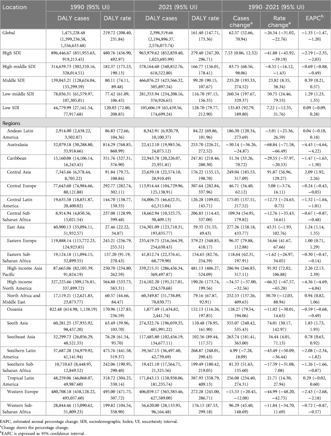 Western Europe accounted for the highest absolute number of AA-related DALYs in 2021 (406,059.2; 95% UI, 365,383.5–427,589.0). However, High-income Asia Pacific showed the highest DALY rate (481.13 per 100,000; 95% UI, 406.27–524.09). Australasia recorded the greatest reduction in DALY rates from 1990 to 2021 (EAPC, −4.43; 95% CI, −4.64 to −4.22), while High-income Asia Pacific demonstrated the most notable increase (EAPC, 2.26; 95% CI, 2.13–2.39). Thirteen regions, including High-income Asia Pacific, surpassed the global DALY rate average (161.40 per 100,000), whereas eight regions, such as North Africa and the Middle East, fell below this level (Table 2, Figure 4B).