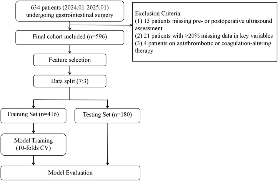 Despite these findings, existing risk assessment tools for perioperative DVT remain limited in predictive accuracy and generalizability. Traditional scoring systems, such as the Caprini or Padua scores, primarily rely on static preoperative variables and may not fully capture dynamic perioperative changes in coagulation status, inflammatory response, and hemodynamics (7, 8). Moreover, their applicability to diverse populations, including Chinese patients undergoing gastrointestinal surgery, remains uncertain. Consequently, there is a pressing need for more precise and individualized risk stratification models that integrate a broader range of clinical, laboratory, and procedural data.