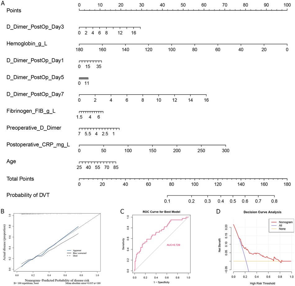 Results: Among the five models, the RF model achieved the best predictive performance. Postoperative Day-7 D-dimer, Day-1 D-dimer, and Day-5 D-dimer were identified as the most important predictive features. The calibration curve and DCA further confirmed the nomogram's predictive accuracy and clinical utility.