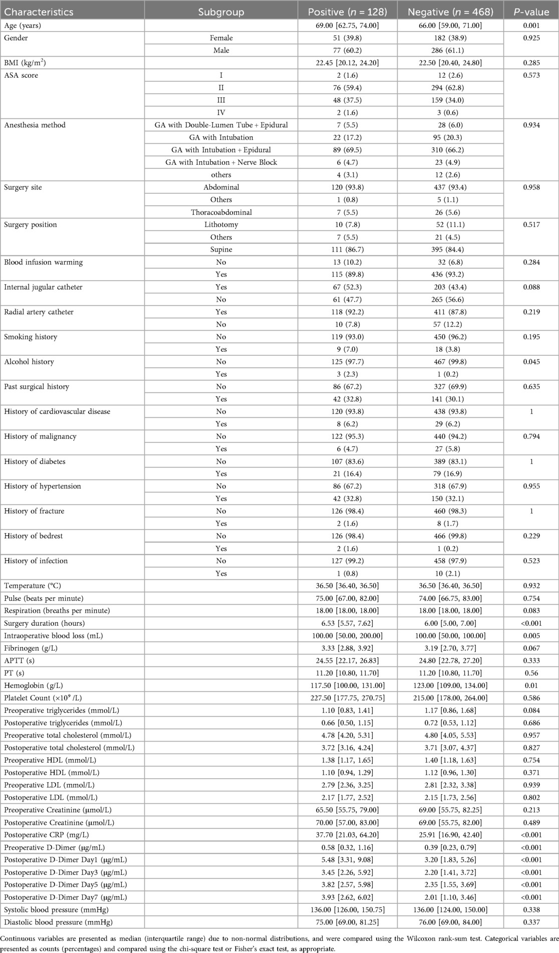 A total of 48 clinical parameters were collected from 596 patients, including age, gender, body mass index (BMI), history of alcohol consumption, smoking history, history of infection, preoperative comorbidities such as diabetes, hypertension or other underlying diseases (cardiovascular disease, fracture, and bedrest ≥3 Days), previous surgical history, and history of malignancy. Preoperative clinical data included total cholesterol (TC), triglycerides (TG), low-density lipoprotein (LDL), high-density lipoprotein (HDL), creatinine (Cr), and D-dimer. Postoperative clinical data included TC, TG, LDL, HDL, Cr, D-dimer, C-reactive protein (CRP), D-dimer postoperative Day-1, −3, −5, and −7, systolic blood pressure, and diastolic blood pressure. Surgical and pathological data included American Society of Anesthesiologists (ASA) score, anesthesia method, Fibrinogen, activated partial thromboplastin time (APTT) seconds, prothrombin time (PT) seconds, hemoglobin, platelet count, surgery site, surgery position, temperature, pulse, respiration, blood infusion warming, surgery duration, intraoperative blood loss, internal jugular catheter, and radial artery catheter. Missing data were imputed using the multivariate imputation by chained equations (MICE) method, which models each variable with missing values as a function of the other variables in an iterative manner.