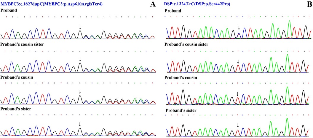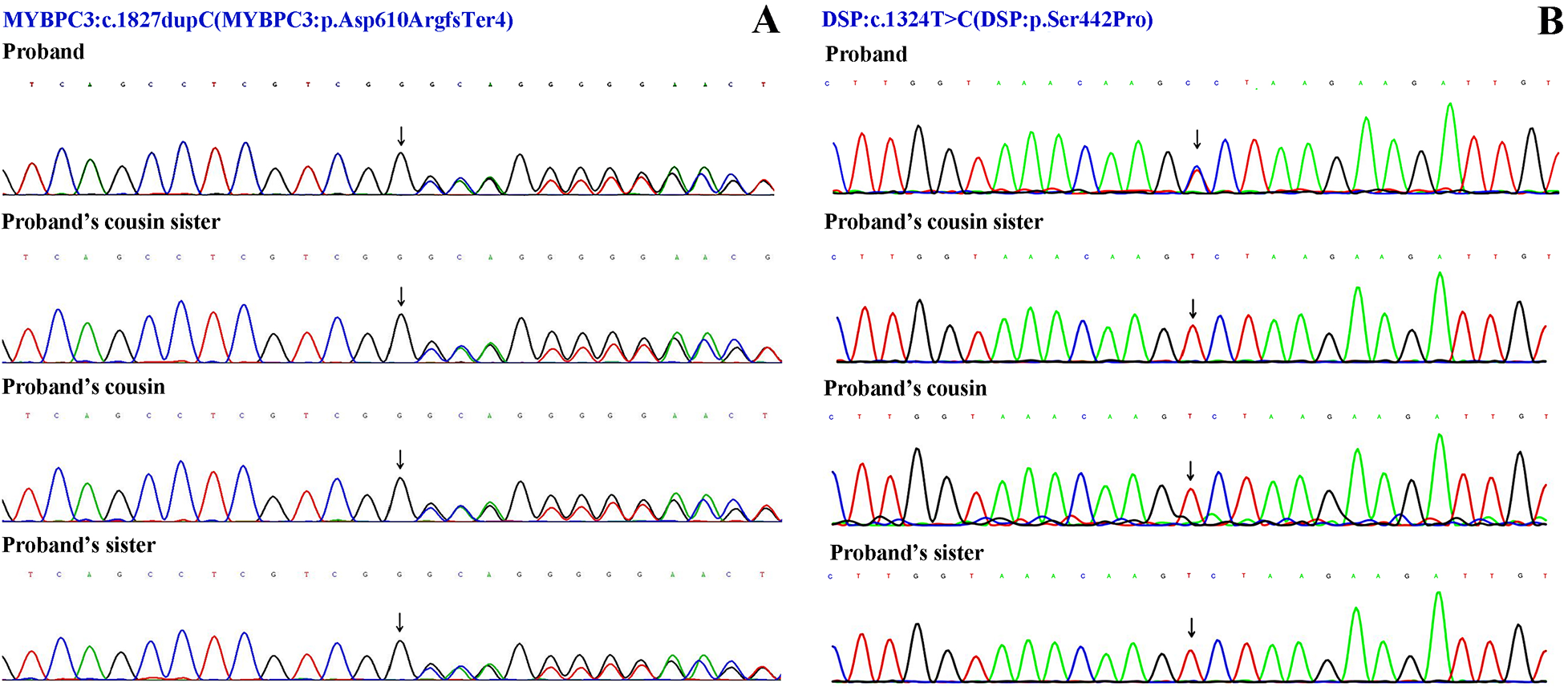 Sanger sequencing results. (A) The variant NM_000256.3: c.1827dupC (p. Asp610ArgfsTer4) of MYBPC3 gene. (B) The variant NM_004415.4: c.1324T>C (p. Ser442Pro) of DSP gene.