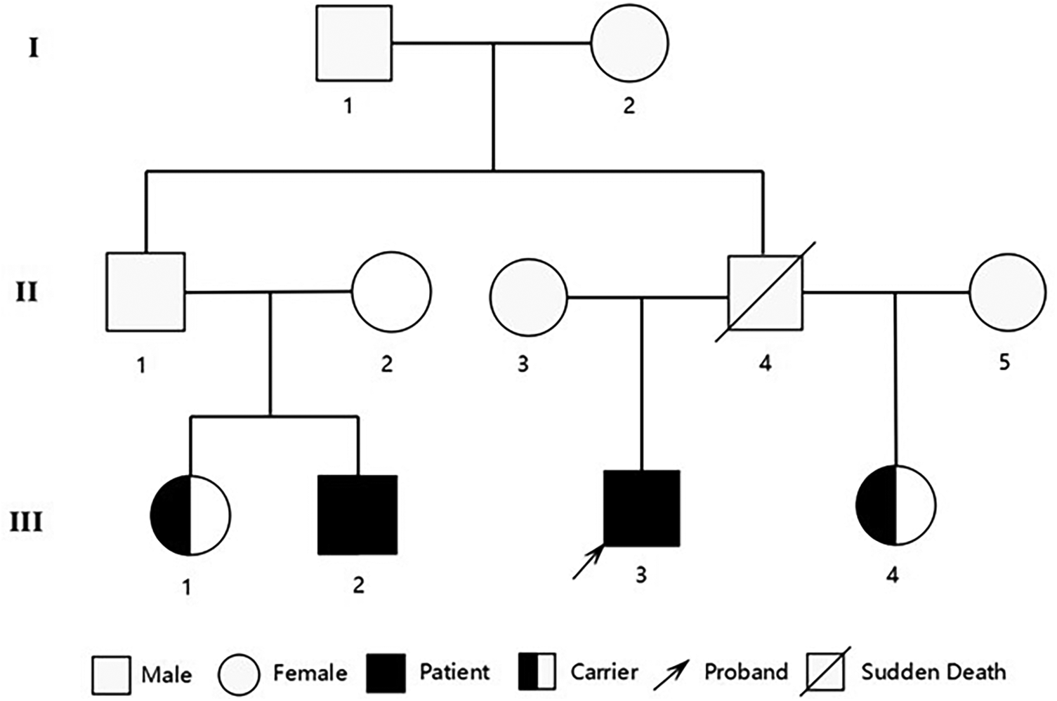 The proband was a 40-year-old male who presented with exertional dyspnea for one year and substernal chest pain for one week. He had no history of hypertension, diabetes mellitus, or dyslipidemia and denies any history of smoking or alcohol consumption. His father experienced sudden cardiac death (SCD) at the age of 41; however, no specific details regarding his premorbid symptoms or postmortem findings are available.