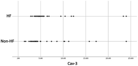 Importantly, serum Cav-3 was higher in HF [median 4.83 (4.34–5.60) ng/L] than in non-HF [3.97 (3.30–4.96) ng/L; p < 0.001]. Groupwise distributions are shown in Figure 1.