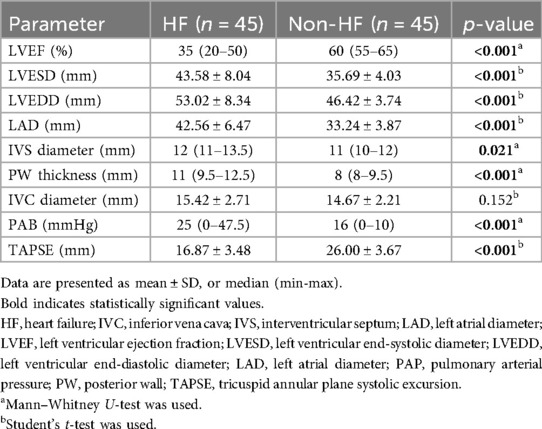 Echocardiography findings (Table 2) reflected typical HF remodeling. Median LVEF was markedly lower in HF [35% (20–50)] than in non-HF [60% (55–65); p < 0.001]. Left-sided chamber dimensions were larger in HF: LVESD 43.58 ± 8.04 mm vs. 35.69 ± 4.03 mm and LVEDD 53.02 ± 8.34 mm vs. 46.42 ± 3.74 mm (both p < 0.001). LAD was greater (42.56 ± 6.47 mm vs. 33.24 ± 3.87 mm; p < 0.001) and wall thicknesses were increased (IVS median 12 vs. 11 mm, p = 0.021; PW median 11 vs. 8 mm, p < 0.001). Right-sided function was reduced: TAPSE 16.87 ± 3.48 mm vs. 26.00 ± 3.67 mm (p < 0.001). PAP (listed as PAB in Table 2) was higher in HF (median 25 vs. 16 mmHg; p < 0.001), whereas IVC diameter did not differ significantly (15.42 ± 2.71 vs. 14.67 ± 2.21 mm; p = 0.152). Overall, HF patients showed a consistent pattern of adverse remodeling and impaired systolic function.