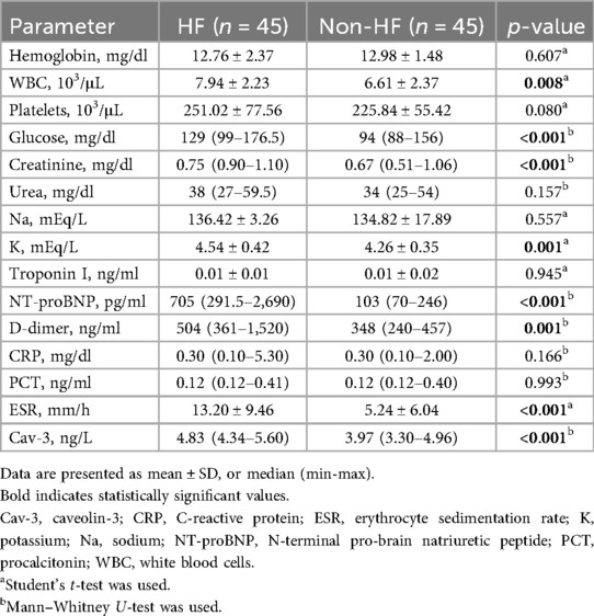 Renal indices showed higher creatinine in HF (p < 0.001), while urea differences were non-significant (p = 0.157). Hemoglobin, platelets, sodium, troponin-I, CRP, and PCT did not differ (all p > 0.05).