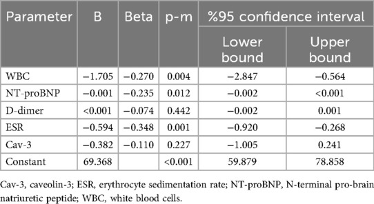 In a linear regression including WBC, NT-proBNP, D-dimer, ESR, and Cav-3 (Table 5), the model was significant [F(5,83) = 8.65, p < 0.001] and explained 30% of EF variance (adjusted R² = 0.303). Independent negative predictors of EF were: