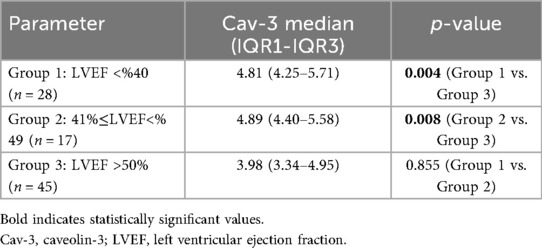 Cav-3 concentrations across LVEF categories are detailed in Table 6. Median (IQR) Cav-3 was 4.81 (4.25–5.71) ng/L in Group 1 (HFrEF; LVEF < 40%, n = 28), 4.89 (4.40–5.58) ng/L in Group 2 (HFmrEF; LVEF 41%–49%, n = 17), and 3.98 (3.34–4.95) ng/L in Group 3 (LVEF > 50%, n = 45). Cav-3 was significantly higher in Group 1 vs. Group 3 (p = 0.004) and Group 2 vs. Group 3 (p = 0.008), with no difference between Group 1 and Group 2 (p = 0.855). This pattern indicates higher Cav-3 concentrations in both reduced and mildly reduced EF categories compared with individuals with preserved EF.