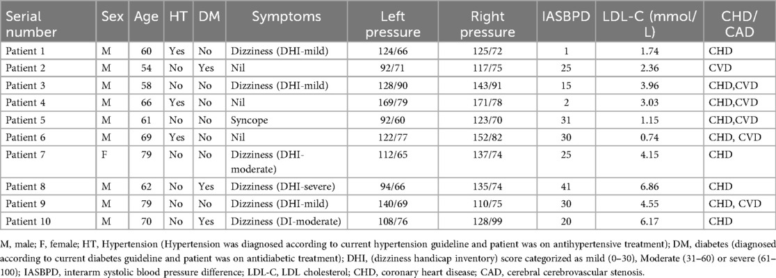 The median age of the patients was 65.80 (range: 54–79) years including 9 male and 1 female patient. 3 patients had hypertension, and other 3 had diabetes. 7 of them had high LDL cholesterol. 3 cases were asymptomatic and diagnosed with subclavian artery narrowing through color Doppler ultrasound. 6 patients presented with dizziness, while 1 presented with syncope and 1 presented with left hand numbness without neurological deficit. Dizziness was assessed using dizziness handicap index questionnaires (DHI). The systolic pressure difference between the left and right arms was 21.00 mmHg (range: 1–41 mmHg). 9 patients had coronary heart disease and 6 patients had cerebrovascular disease. All stent diameters were 8 mm except for patient 7 (7 mm). The median procedure time, was 23.10 minutes (range: 15–43 min). Patient baseline data and intraoperative details are shown in Tables 1 and 2.