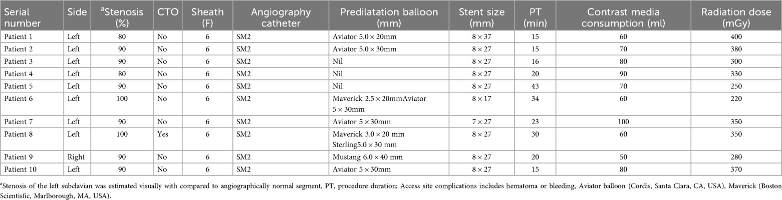 A total of 69 subclavian stent procedures were performed in our Cardiology Division 6, Xiamen Cardiovascular Hospital of Xiamen University, Xiamen, China, between 2021 and 2025. 30 cases were conducted via the radial approach (including both proximal and distal), 19 via femoral approach, and 10 cases utilized both radial and femoral approaches according to operator preference. Among these, we reviewed 10 cases of subclavian stenting procedures performed using a bilateral dTRA.