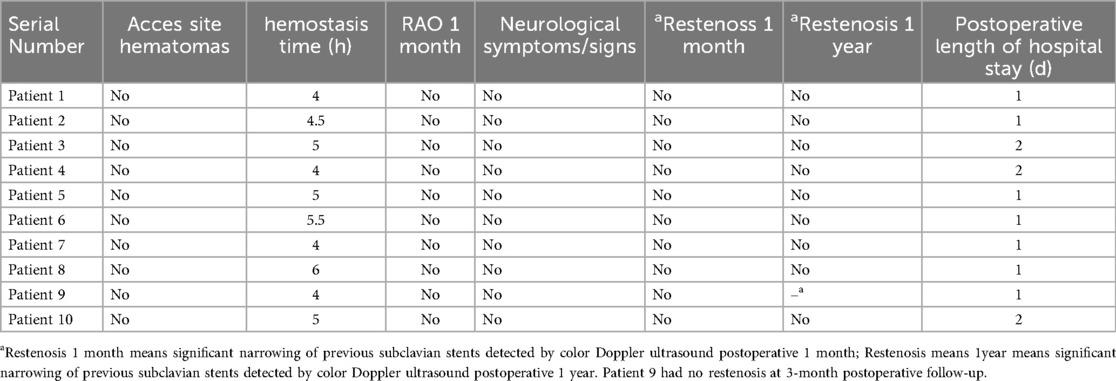 Potential complications of subclavian stenting include dissection, distal digital embolization, and carotid embolization leading to infarction. However, carotid embolization is rare in subclavian stenting, and in our cases, cerebral protection devices were not used. Overall, there were no complications in our patients. Radial artery patency—a key study outcome—was assessed via pulse palpation at the wrist and snuffbox on postoperative day 1 and at 1-month follow-up. Although pulse weakening occurred in the proximal segment of 4 patients, patency was preserved without overt occlusion. Vascular remodeling may have occurred in these cases, warranting longer-term observation. To improve rigor, future studies will incorporate ultrasound confirmation and extended follow-up.