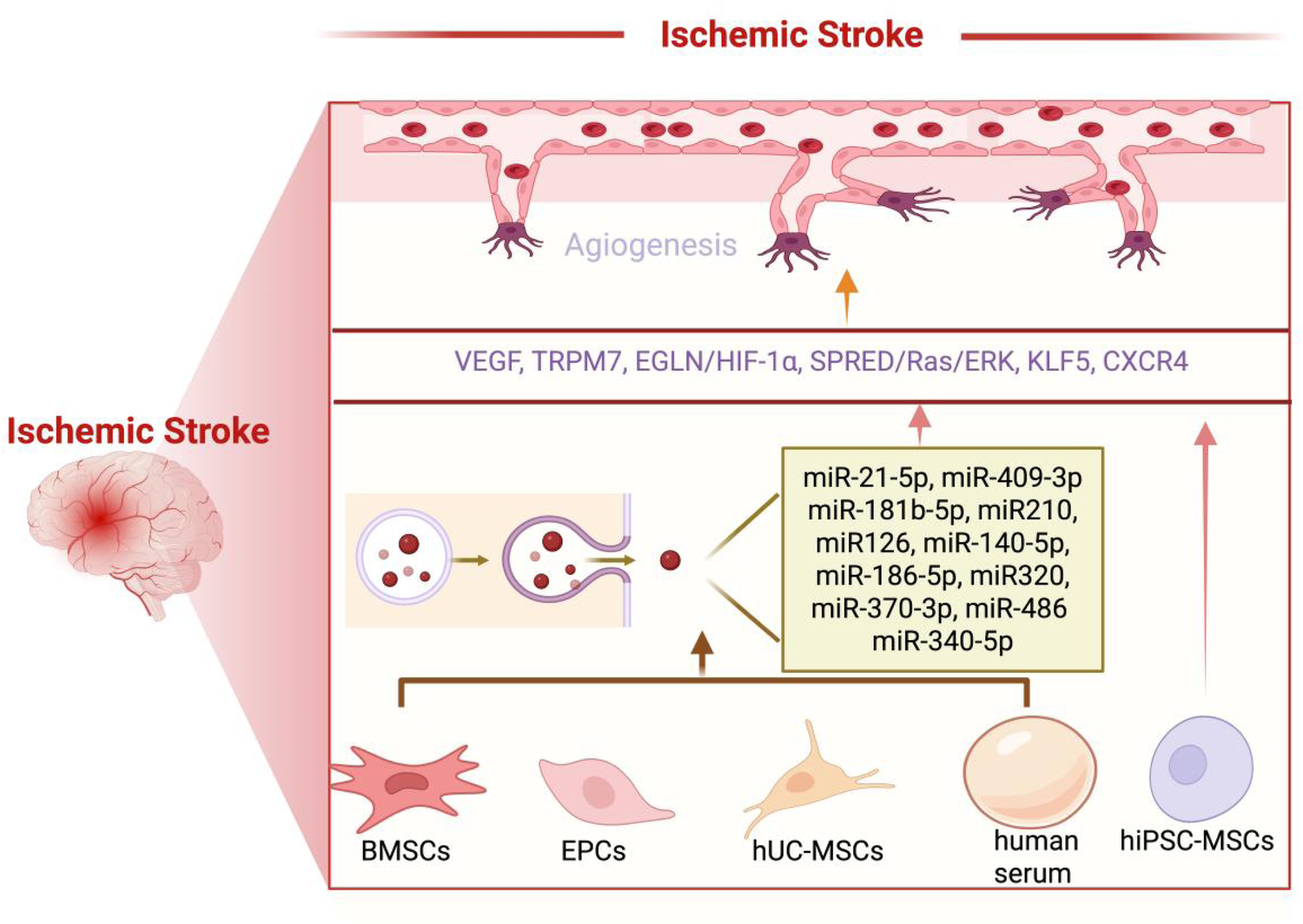 Following ischemic stroke, MSCs-EVs can effectively promote angiogenesis, contributing to the recovery of cerebral vasculature and overall brain function. (1) BMSCs-EVs promote angiogenesis by releasing a variety of microRNAs, including miR-21-5p, miR-486, miR-181b-5p, miR-210, miR-126, miR-140-5p, miR-186-5p, miR-370-5p, and miR-409-3p. These microRNAs act on key targets such as VEGF, TRPM7, EGLN1/HIF-1α, and the SPRED1/Ras/ERK pathway, thereby stimulating the regeneration of blood vessels. (2) hUC-MSCs-EVs promote angiogenesis by releasing miR-320, which acts on KLF5. (3) hiPSC-MSC-EVs promote angiogenesis by releasing VEGF and CXCR4. (4) Human serum promotes angiogenesis by releasing miR-340-5p. (5) EPCs promote angiogenesis by releasing miR-126. Created using BioRender.com.