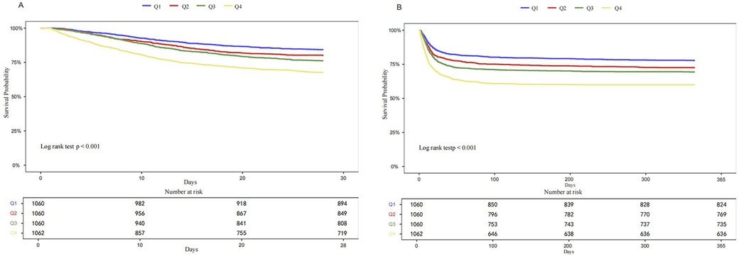 Kaplan-Meier survival curves compare four groups (Q1, Q2, Q3, Q4) over time in panels A and B. Both graphs depict survival probability against days, with Q1 (blue) showing higher survival, and Q4 (yellow) lower. Log rank tests yield p-values less than 0.001 for both, indicating significant differences. Tables below display the number at risk per group for different time intervals.