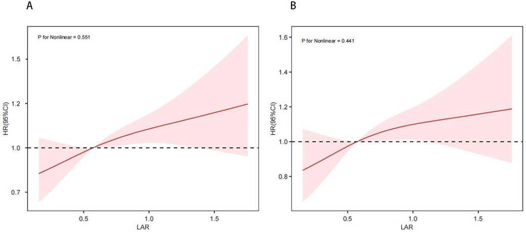 Two graphs labeled A and B show hazard ratios (HR) with 95% confidence intervals (CI) plotted against LAR. Both graphs depict red lines with shaded areas indicating CI. Graph A shows a non-linear p-value of 0.551, and HR ranges from 0.7 to 1.5. Graph B shows a non-linear p-value of 0.441, with HR ranging from 0.8 to 1.6. Both graphs include a horizontal dashed line at HR equals 1.
