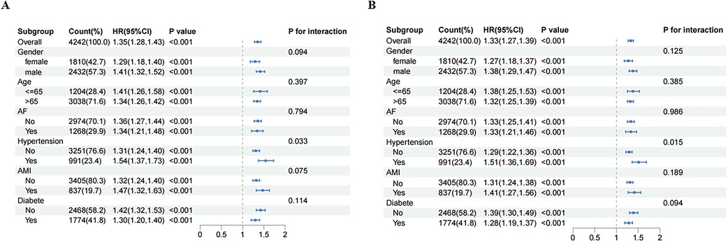 When 28-day mortality was taken as the observation outcome, no significant interaction effects were observed across subgroups stratified by age, sex, AF, diabetes, and AMI. However, a significant interaction was identified in the hypertension subgroup (P for interaction = 0.033) (Figure 4A). A similar interaction was observed for 365-day mortality among hypertensive patients (P for interaction = 0.015; Figure 4B).