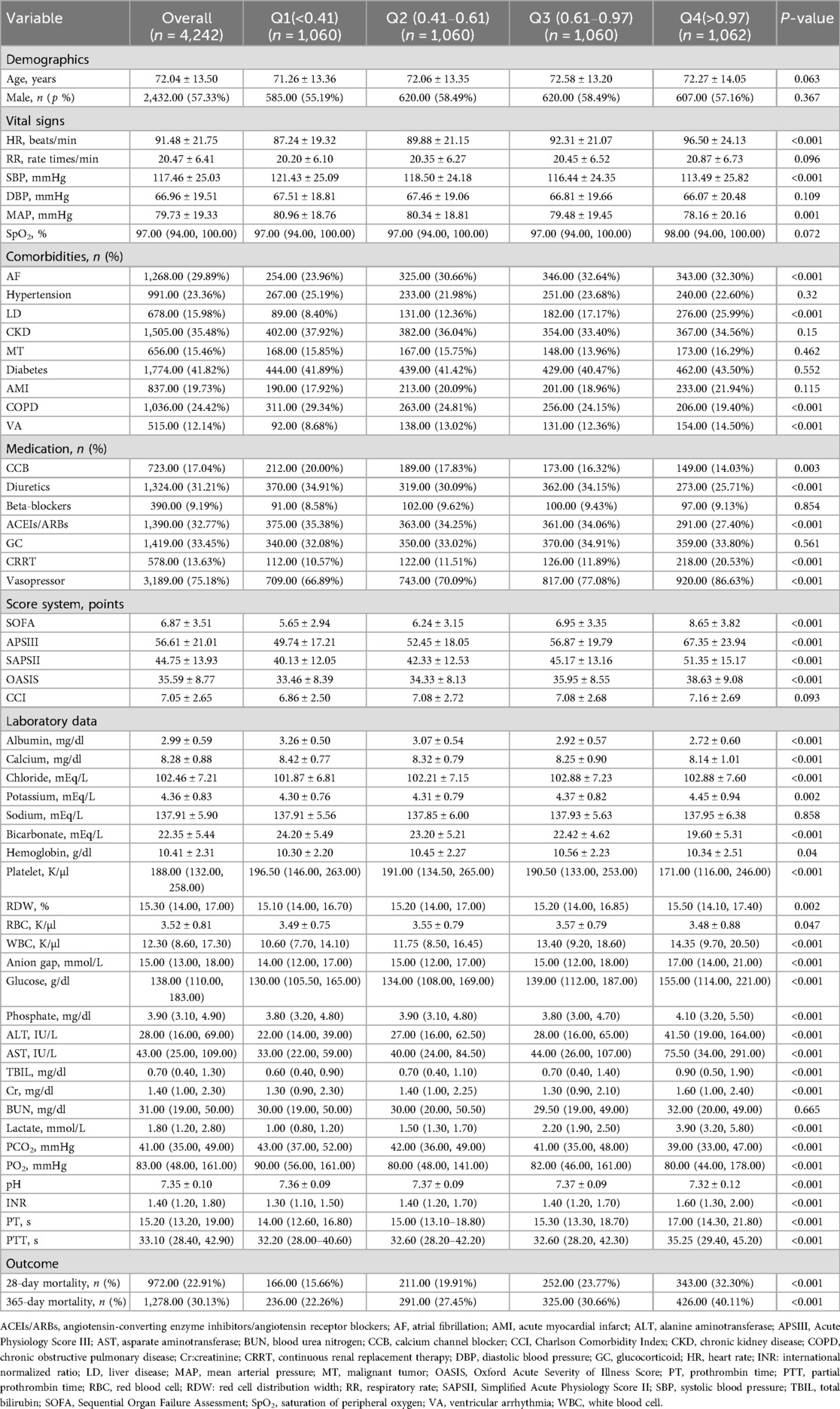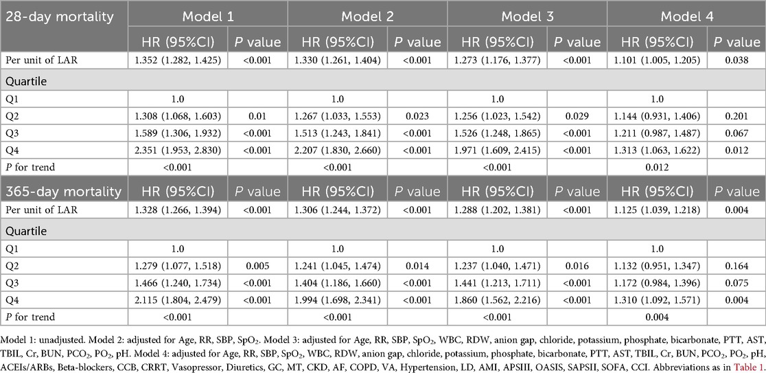 A total of 4,242 patients met the inclusion criteria and were included in the analysis. The mean age of the enrolled patients was 72.04 ± 13.50 years old, and 57.33% were male. The 28-day and 365-day mortality rates were 22.91% and 30.13%, respectively. Based on the quartiles of LAR (Q1: <0.41, Q2: 0.41–0.61, Q3: 0.61–0.97, Q4: >0.97) at admission, participants were stratified into four groups (Table 1). Compared with the low-LAR group (Q1), the high-LAR group (Q4) exhibited a significantly faster HR, lower SBP and MAP. Laboratory test results indicated that the high-LAR group had higher levels of WBC, RDW, anion gap, glucose, phosphate, potassium, ALT, AST, Cr, lactate, and longer PT and PTT. The high-LAR group was more likely to have complications such as AF, LD, and VA. Regarding disease severity scores, the high-LAR group had significantly higher SOFA, APSIII, SAPSII, and OASIS scores. Additionally, the high-LAR group showed lower usage rates of anti-heart failure medications and higher utilization rates of CRRT. Notably, both 28-day mortality (15.66% vs. 19.91% vs. 23.77% vs. 32.30%; P < 0.01) and 365-day mortality (22.26% vs. 27.45% vs. 30.57% vs. 40.21%; P < 0.01) were higher in the Q4 group compared with the other three groups, while no significant differences were observed among the Q1, Q2, and Q3 groups.