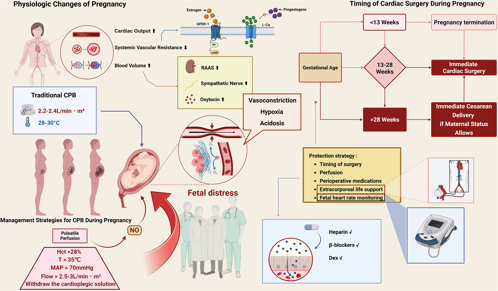 Schematic summary of pregnancy-related physiological changes, CPB risks, and protection strategies. Created in BioRender. Dong, Z. (2025) https://BioRender.com/v11n621. Pregnancy increases cardiac output, blood volume, and systemic vasodilation via hormonal and neurohormonal pathways. Traditional CPB with hypothermia or low flow may lead to vasoconstriction, hypoxia, acidosis, and fetal distress. Protective strategies include maintaining adequate perfusion (flow >2.5–3.0 L/min·m2, MAP >70 mmHg, normothermia >35 °C, Hct >28%), timing of surgery, fetal monitoring, and appropriate perioperative medications. Cesarean delivery is recommended before cardiac surgery when gestational age exceeds 28 weeks. GPER-1, G protein-coupled estrogen receptor-1; RAAS, renin–angiotensin–aldosterone system; MAP, mean arterial pressure; Hct, hematocrit; DEX, dexmedetomidine; CO, cardiac output; NO, nitric oxide.