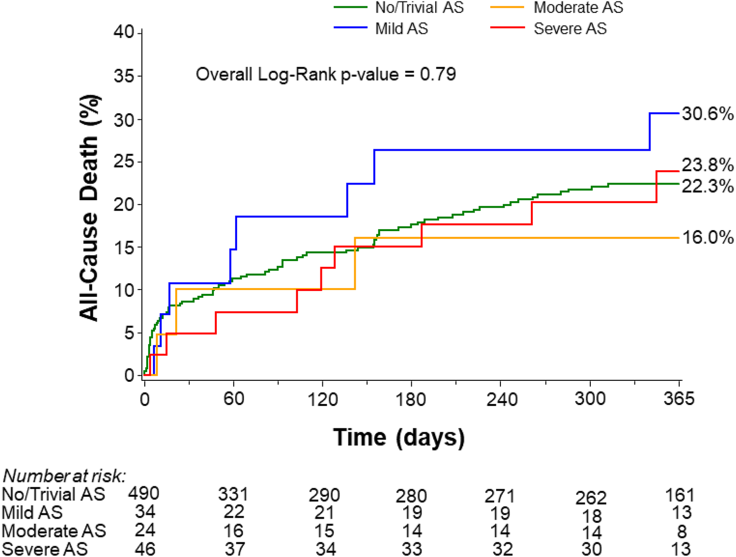 Angiographic and procedural patient characteristics stratified by AS severity are shown in Supplementary Tables S3 and S4, respectively. Femoral arterial access was used in 79.7% of patients with no/trivial AS, 80% with mild AS, 95.7% with moderate AS, and 93.5% with severe AS (p = 0.04). The median [IQR] number of lesions treated during the index cardiac catheterization procedure was similar across groups (no/trivial AS, 2.0 [2.0, 3.0]; mild AS, 2.0 [1.0, 3.0]; moderate AS, 2.0 [1.0, 3.0]; or severe AS, 2.0 [1.0, 3.0]; p = 0.55). Severe calcification was higher in the moderate AS group (no/trivial AS, 51.1%; mild AS, 50%; moderate AS, 71.1%; and severe AS, 59.3%; p = 0.03). The use of atherectomy was higher among patients with moderate or severe AS compared with no/trivial AS (no/trivial AS, 37.1%; mild AS, 51.5%; moderate AS, 75.0%; severe AS, 54.3%; p = 0.0002). PCI for LM was performed in 46.1% of patients with no/trivial AS, 61.8% with mild AS, 50% with moderate AS, and 58.7% with severe AS (p = 0.14). No significant differences were observed in the pre-PCI or post-PCI TIMI flow across groups.
