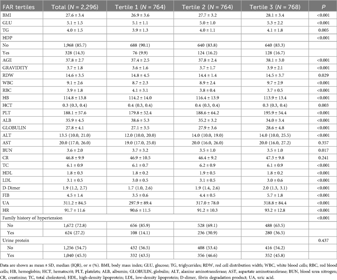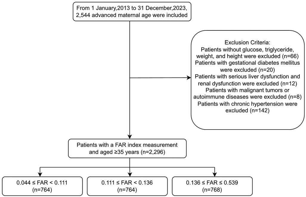 The study initially included 2,544 pregnant women of AMA (≥35 years) who met the inclusion criteria of a single pregnancy, available medical records, and complete laboratory tests. Women were excluded if they had missing glucose, triglyceride (TG), weight, or height measurements (n = 66); gestational diabetes mellitus (n = 20); severe liver or renal dysfunction (n = 12), which could significantly affect fibrinogen and albumin levels; malignant tumors or autoimmune diseases (n = 8); or chronic hypertension (n = 142). After exclusion, 2,296 women remained, who were further categorized into groups based on FAR: Tertile 1, FAR < 0.111; Tertile 2, 0.111≤ FAR < 0.136; and Tertile 3, FAR ≥ 0.136. Among these, 328 women had preeclampsia and 1,968 did not (Figure 1). Patients with severe liver or renal dysfunction were excluded to avoid confounding effects on fibrinogen and albumin levels, which could compromise the validity of FAR × 100 as a predictive biomarker.