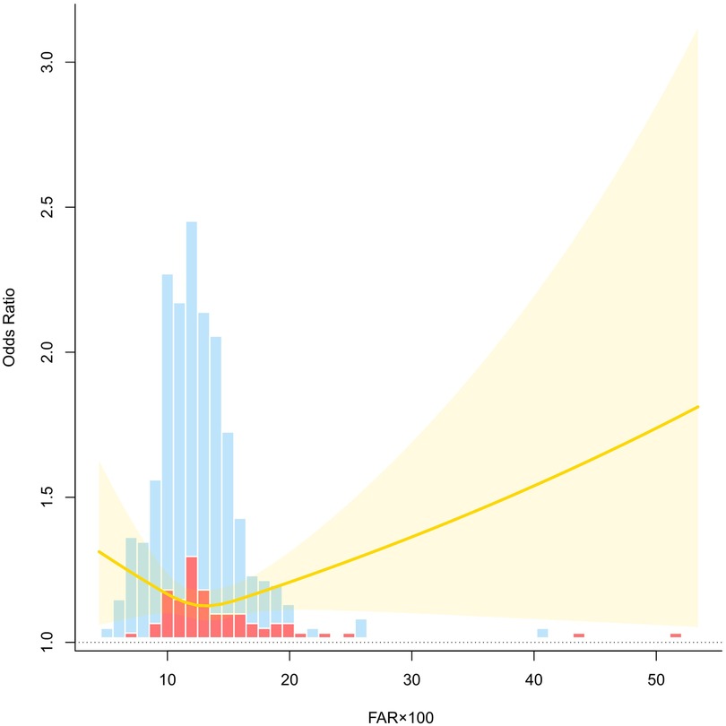 An RCS model was fitted to explore the nonlinear association between FAR × 100 and risk of preeclampsia. After adjusting for age, gravidity, parity, family history of hypertension, creatinine levels, BMI, and glucose levels, the curve revealed a J-shaped relationship. At lower levels of FAR × 100, the OR remained relatively stable and close to 1.0, suggesting no significant increase in risk. However, as FAR × 100 exceeded approximately 15, the OR increased rapidly with a widening CI, indicating growing uncertainty at higher FAR values. The upward trajectory of the curve at higher FAR levels suggests a dose-response trend, where an elevated FAR × 100 is associated with an increased preeclampsia risk. The shaded region denotes the 95% confidence band, and the histogram bars represent the distribution of cases and controls across the FAR × 100 range. These findings support the nonlinear effect of FAR on preeclampsia risk and underscore the potential threshold beyond which FAR becomes a clinically relevant marker of elevated risk (Figure 2).