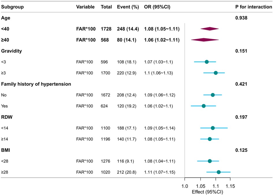 Subgroup analyses were conducted to explore whether the association between FAR × 100 and preeclampsia risk varied across the clinical strata. Adjusted ORs and 95% CIs were calculated using multivariate logistic regression models by treating FAR × 100 as a continuous variable per unit increase. Interaction terms were evaluated with significance set at P < 0.05.