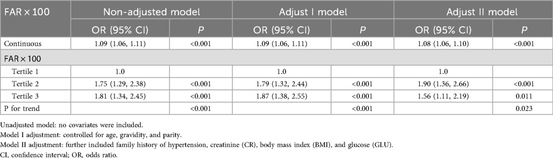 Multivariate logistic regression analyses were performed to assess the association between FAR × 100 and risk of preeclampsia. Three models were constructed: Model 1 was unadjusted; Model 2 was adjusted for age, gravidity, and parity; and Model 3 was adjusted for all variables in Model 2 plus family history of hypertension, creatinine (CR), body mass index (BMI), and glucose (GLU). Odds ratios (ORs) with 95% confidence intervals (CIs) are reported. FAR × 100 was analyzed both as a continuous variable and as a tertile, and a trend test was conducted.