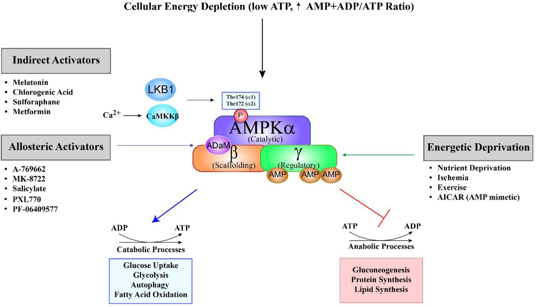 Schematic overview of AMPK activation and its metabolic effects. AMP-activated protein kinase (AMPK) is a heterotrimeric enzyme composed of a catalytic α (alpha), scaffolding β (beta), and regulatory γ (gamma) subunit. It is primarily activated by a decrease in cellular energy levels, reflected by an increased AMP + ADP to ATP ratio. Binding of AMP or ADP to regulatory sites on the γ subunit induces a conformational change that facilitates phosphorylation of the α subunit at Thr172 (α2) or Thr174 (α1) by upstream kinases, primarily LKB1 in the heart. Alternatively, CaMKKβ can activate AMPK independently of AMP/ADP in response to elevated intracellular calcium. AMPK activation can occur via three main mechanisms: (1) Energetic deprivation, triggered by conditions such as nutrient shortage, ischemia, and exercise; (2) allosteric activators, such as A-769662, MK-8722, salicylate, PXL770 and PF-06409577, which bind directly at the allosteric drug and metabolite (aDaM) site located at the interface of the alpha and beta subunits; and (3) indirect activators, including melatonin, chlorogenic acid, sulforaphane, metformin, and AICAR, which modulate upstream signaling pathways. Upon activation, AMPK shifts cellular metabolism from anabolic to catabolic pathways to restore energy balance. This includes promoting processes such as glucose uptake, glycolysis, autophagy, and fatty acid oxidation, while suppressing energy-consuming pathways like gluconeogenesis, lipid synthesis, and protein synthesis.