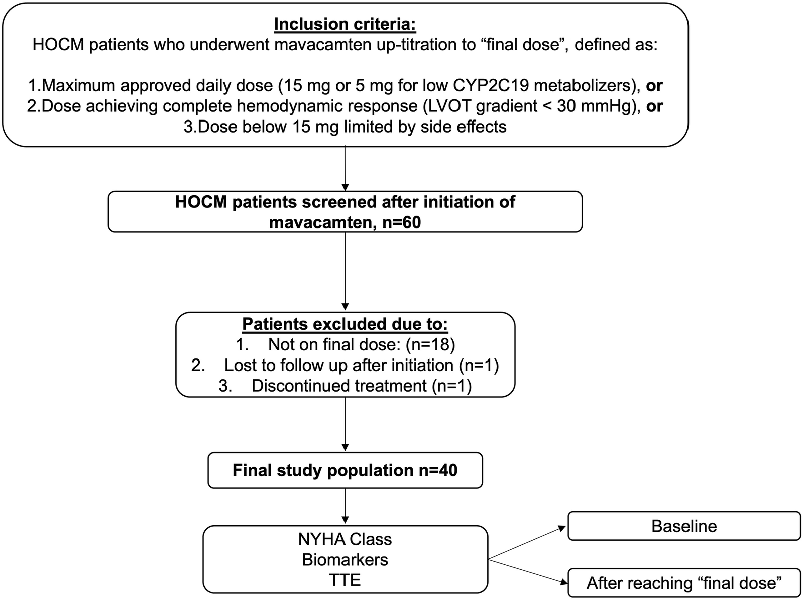 The study included consecutive patients who underwent up-titration of mavacamten and reached their presumed “final” dose. This final dose was defined as one of the following: (i) the maximum approved daily dose of 15 mg (or 5 mg for low CYP2C19 metabolizers), (ii) a dose that achieved a complete hemodynamic response, characterized by a maximum LVOT gradient of <30 mmHg, or (iii) a dose below the maximum of 15 mg due to mavacamten-related side effects even if a complete hemodynamic response was not achieved.