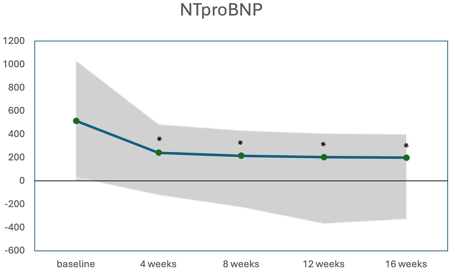 The changes in LVOT gradient at rest, during Valsalva, and after exercise, along with NT-proBNP levels over the first weeks of treatment are illustrated in Figures 2, 3. There was a significant reduction in the mean LVOT gradient already after 4 weeks of treatment which further declined at 8, 12 and 16 weeks with all changes being significant compared to baseline. The mean change from baseline to 12 weeks was −24 ± 32 mmHg at rest, −65 ± 82 mmHg at Valsalva and −99 ± 72 mmHg at exercise. Moreover, NT-proBNP levels decreased significantly after 4 weeks (p = 0.032) and further decreased until week 16, all values significantly different compared to baseline.