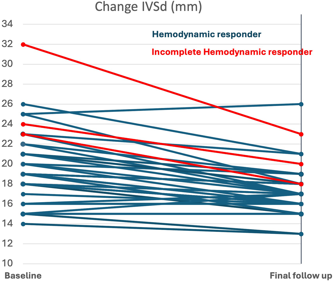 Patients without complete hemodynamic response demonstrated a similar absolute treatment effect in LVOT gradient reduction as those who were complete hemodynamic responders. Comparison of baseline characteristics revealed that incomplete hemodynamic responder had significantly higher IVSd and LV mass index, along with a trend toward elevated troponin levels, indicating either more advanced or more severe disease stage.