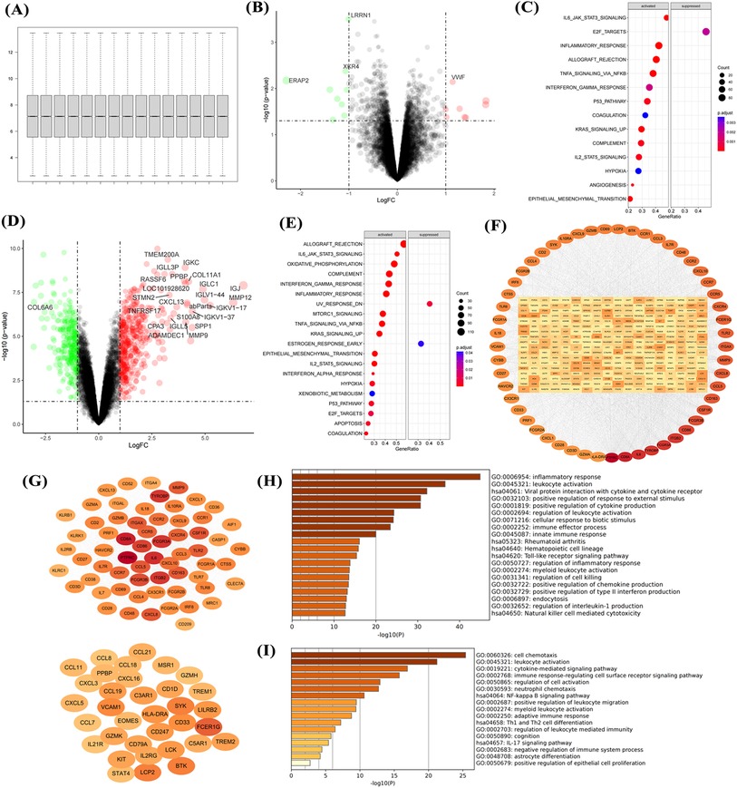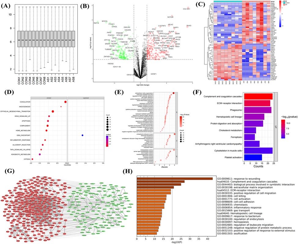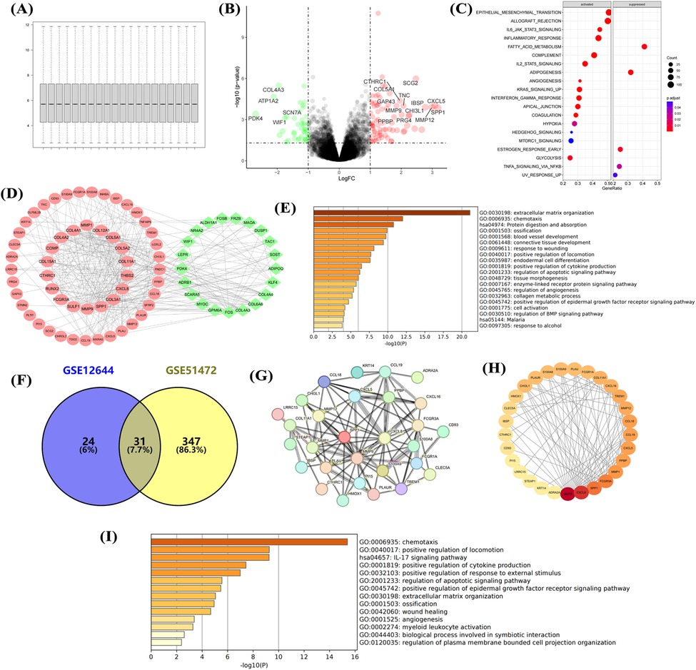 Figure 2. Transcriptional dysregulation in aortic calcification. Sample normalization of the GSE12644 dataset (A), DEGs in aortic calcification patients compared with control group (B), GSEA (C), PPI network (D), and GO/KEGG enrichment analysis (E); identification of intersection genes, PPI network (G,H), and GO/KEGG enrichment analysis (I). D: Red for upregulated genes, green for downregulated genes; H: Ranked by Degree, with darker colors indicating higher ranks. Sample size: Control group (n = 10); AS group (n = 10).
