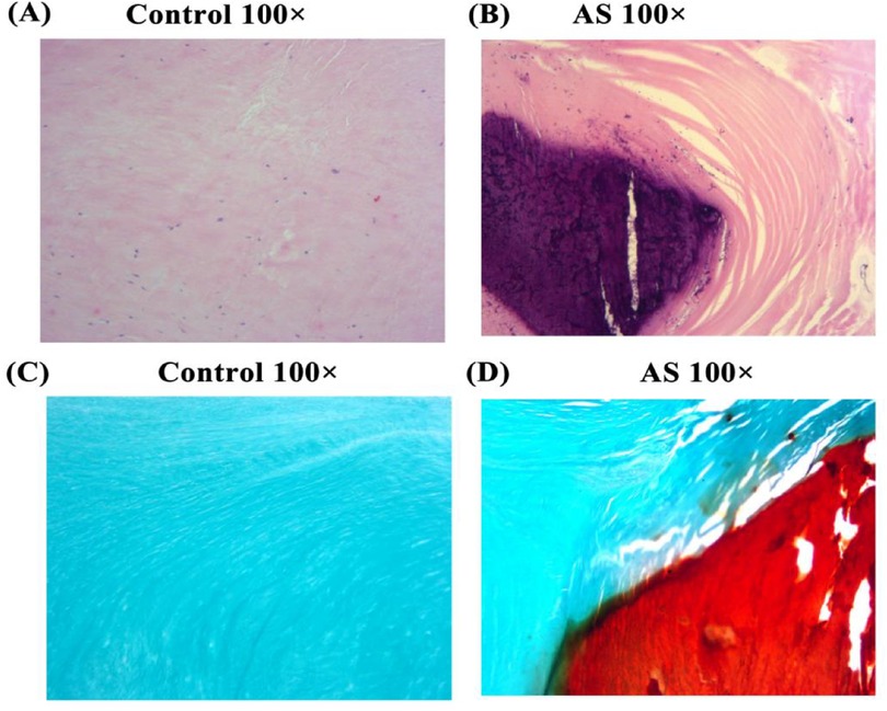 Figure 3. He and alizarin red staining. HE and alizarin red staining of tissues from non-stenotic (A,C) and stenotic (B,D) aortic valves.