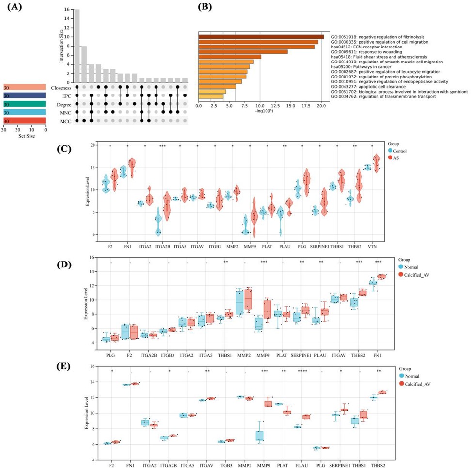 Figure 5. Identification and expression analysis of hub genes. Hub gene identification by multi-algorithms (A), enrichment analysis of hub genes (B), expression analysis of hub genes in proteomic sequencing (C), and their expression in GSE12644 and GSE51472 datasets (D,E). differences in mean values between the control group and AS group were analyzed using an independent samples t-test. Statistical significance was set at P < 0.05.