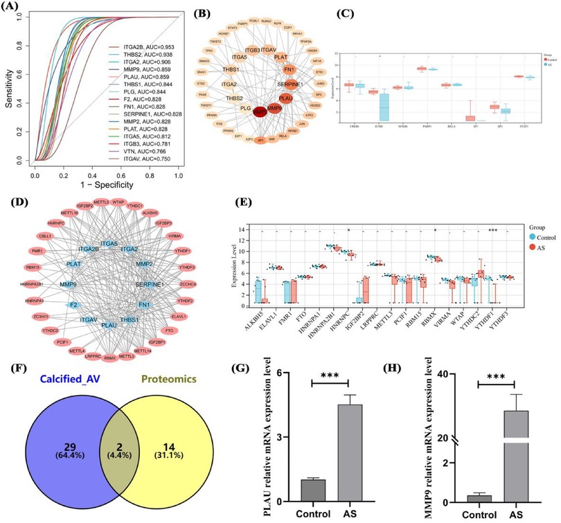 Figure 6. Diagnostic efficacy, transcriptional regulation, RNA modification, and expression validation of hub genes. ROC curves of hub genes in proteomics (A), transcriptional regulatory network (B) and expression analysis (C) of hub genes, m6A modification (D) and expression analysis (E) of hub genes, intersection analysis of transcriptomic DEGs and hub genes (F), and mRNA expression validation of overlapping genes (G,H). Sample size: Control group (n = 8); AS group (n = 8). differences in mean values between the control group and AS group were analyzed using an independent samples t-test. Statistical significance was set at P < 0.05.