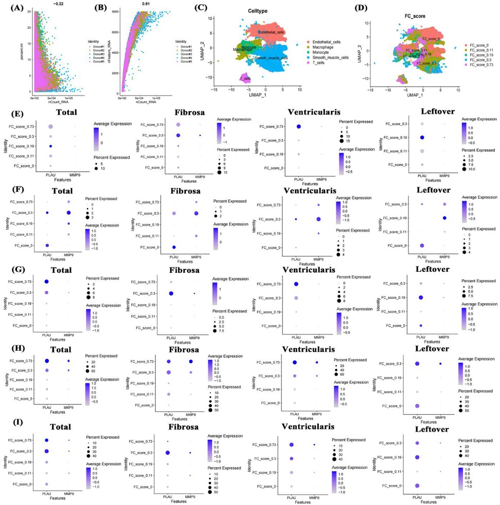 Figure 7. Single-cell transcriptome data analysis of valve calcification patients. Data quality control (A,B), UMAP of cell annotation and calcification scores (C,D), expression of PLAU and MMP9 in smooth muscle cells, T cells, endothelial cells, macrophages, and monocytes across different FC scores and positions (E–I). FC score: fibro-calcification score.