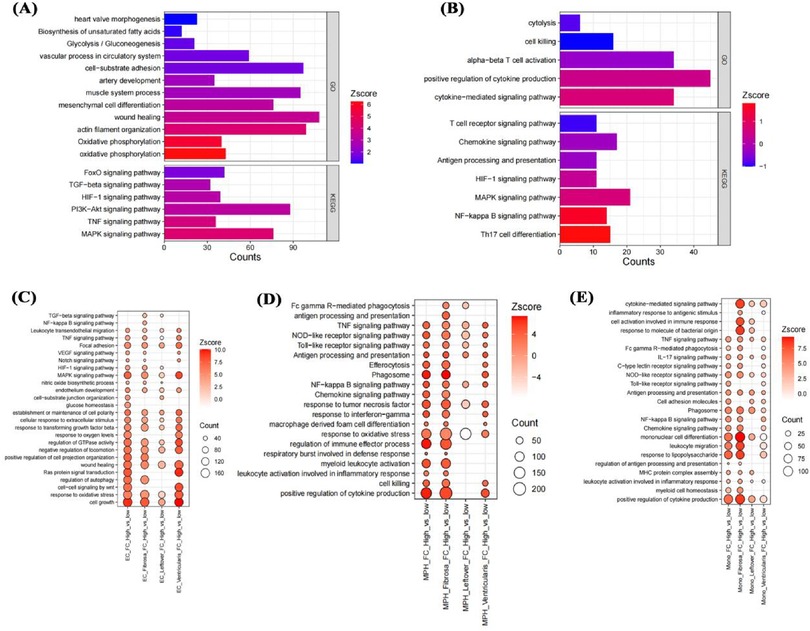 To clarify the impact of fibrosis on different cells, the study conducted a systematic analysis of 5 cell types in different regions separately. In smooth muscle cells, higher FC scores were associated with significant changes in cardiac valve morphology, glycolysis, damage repair, TGF-β signaling pathway, and HIF-1 signaling pathway compared with lower FC scores (Figure 8A). In T cells with higher FC scores, cytokine production, T cell receptor signaling pathway, NF-κB signaling pathway, and HIF-1 signaling pathway were significantly altered compared with lower scores (Figure 8B). In different regions of the aortic valve, highly calcified endothelial cells showed significant upregulation of TNF signaling pathway, MAPK signaling pathway, endothelial cell development, and response to oxidative stress (Figure 8C). In macrophages, the highly calcified fibrosa layer showed stronger proinflammatory signals (Figure 8D). Similar to macrophages, monocytes in the highly calcified fibrosa layer also showed enhanced proinflammatory signals (Figure 8E), possibly an important factor in their differentiation into macrophages.