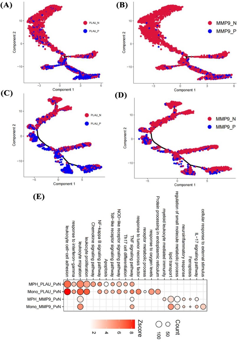 Figure 9. Effects of genes on cell pseudotime and functions. Impact of PLAU and MMP9 on differentiation trajectories of monocytes (A,B) and macrophages (C,D); effects on functions of endothelial cells, monocytes, and macrophages in the fibrosa layer (E).
