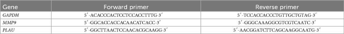 PCR experiments were performed to detect the mRNA expression levels of MMP9 and PLAU in aortic valve tissues. Specific steps: frozen tissues were ground in liquid nitrogen, lysed using an RNA extraction kit, centrifuged to remove impurities, and total RNA was purified by binding to an RNA adsorption column. Reverse transcription was performed according to the Takara PrimeScript RT Master Mix instructions (42 °C for 15 min, 85 °C for 5 s to inactivate), synthesizing cDNA; qPCR amplification was performed using Takara SYBR Premix Ex Taq (95 °C pre-denaturation for 30 s, 40 cycles: 95 °C for 5 s, 60 °C for 30 s). Melting curves were used to verify product specificity, and the relative expression of target genes was calculated. The primer sequences as shown in Table 1.