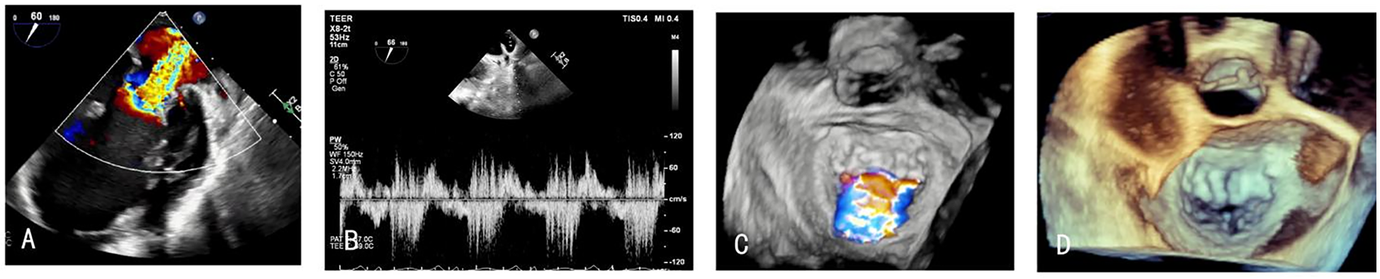 (A,C,D) TEE showing the MR between A2 and P2, (B) pulmonary vein systolic flow reversal before the procedure.