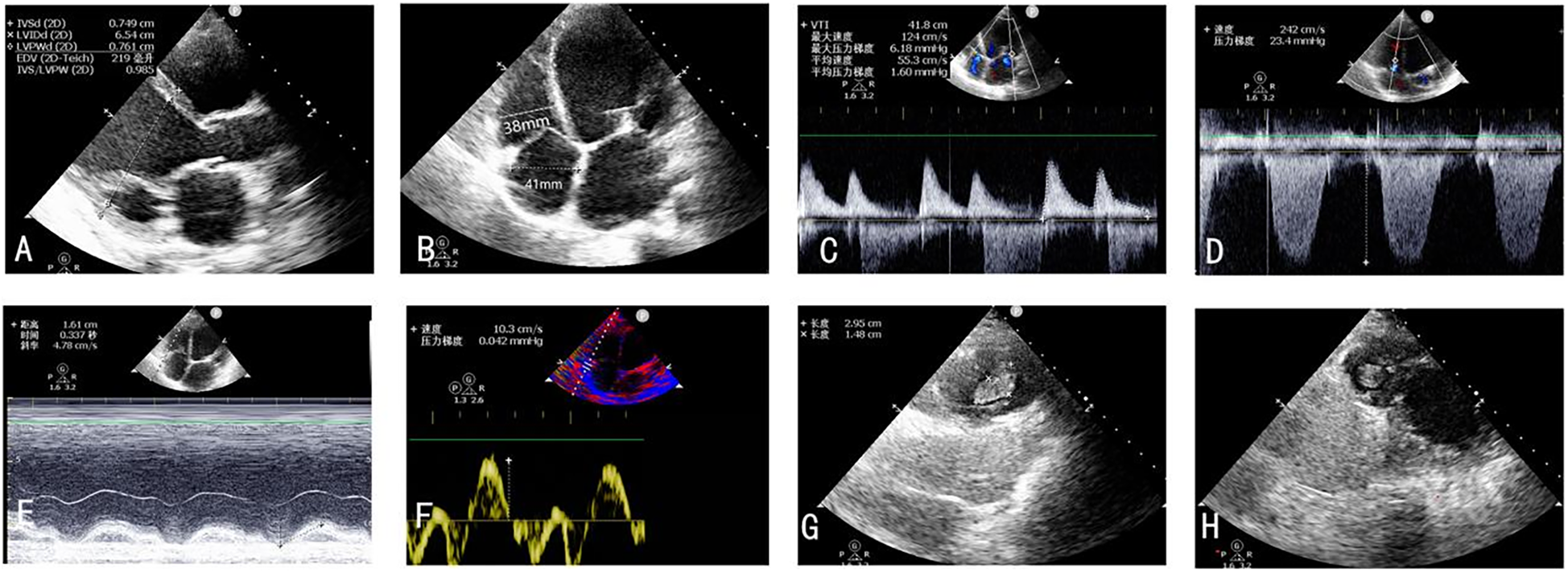 (A–F) TTE postoperative day 2 revealed significant improvement in biventricular systolic function alongside favorable hemodynamic changes. (G,H) Thrombus forming in the right ventricle on the second postoperative day.