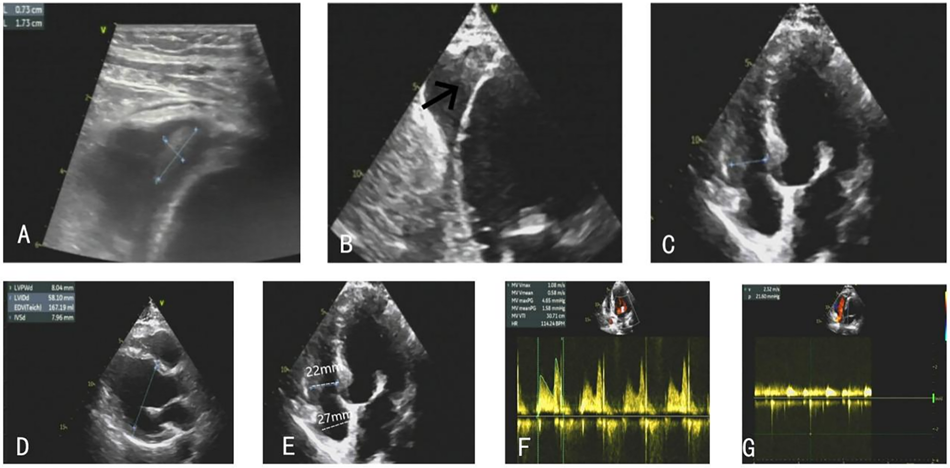 At the 1-month follow-up, repeat TTE demonstrated further diminution of the thrombi. After 7 months of anticoagulation therapy, follow-up echocardiography confirmed complete resolution of the thrombus, stable clips with mild MR, and preserved valvular function. At this time, the INR was therapeutic at 2.31, with a mean mitral valve pressure gradient of 1.6 mmHg and a peak mitral inflow velocity of 108 cm/s (Figures 4D–G). No thromboembolic complications or recurrent thrombus formation were observed during the surveillance period, and noparadoxical embolic events occurred, including stroke, systemic infarction, or hypoxemia.